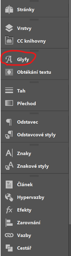 Jedna možnosť (tá náročnejší) je nakresliť si požadovaný špeciálny znak pomocou pentoolu, alebo za využitie jednoduchých tvarov (obdĺžnik, elipsa, mnohouholník). Táto cesta je však veľmi zdĺhavá, pretože trafiť sa do správneho štýlu a zladiť ho s naším vybraným fontom môže byť veľmi časovo náročné. Preto v InDesignu (konkrétne v pravom paneli) nájdeme možnosť glyfov: