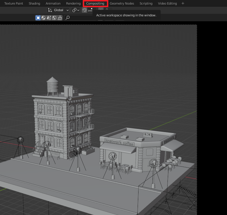 Upravujeme tu obrázky alebo videá do finálnej podoby. Môžeme nastavovať a vytvárať rôzne filtre, efekty, upravovať farby a pridávať videá alebo obrázky.Pracovný priestor Compositing sa nachádza v hornej lište vedľa Rendering: