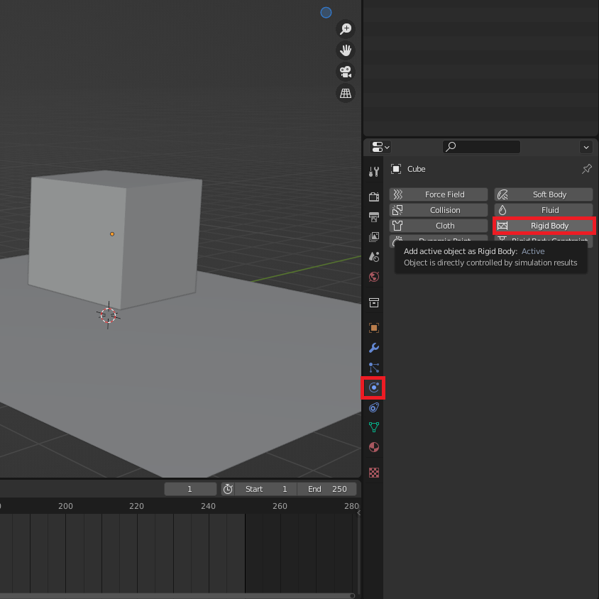 Označíme si objekt Cube a na pravej strane máme editor Properties. V ňom si rozklikneme menu Physic Properties s ikonou kruhu a kružnice. Môžeme tu vidieť druhy simulácií, ktoré sa dajú na objekt nastaviť. My si zvolíme Rigid Body: