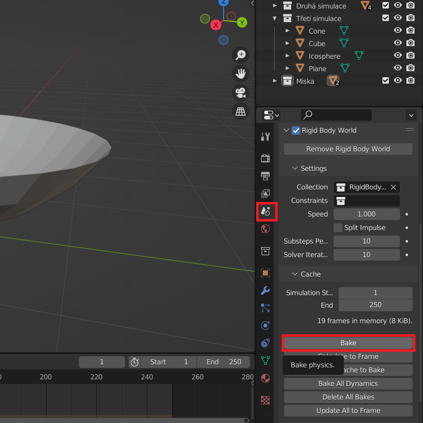 K nastaveniu sa dostaneme v hornej časti Properties v menu Scene Properties. Tu máme záložku Rigid Body World, a keď si rozklikneme Cache, tak nižšie môžeme vidieť tlačidlo Bake. To keď stlačíme, tak sa nám simulácia vypečie: