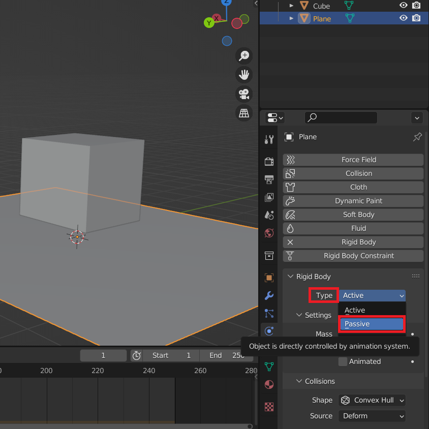 A to isté nastavíme aj pri objekte Plane. S tým rozdielom, že v nastavení Type, ktoré sa nachádza úplne hore, si rozklikneme výberové menu a miesto Active klikneme na Passive: