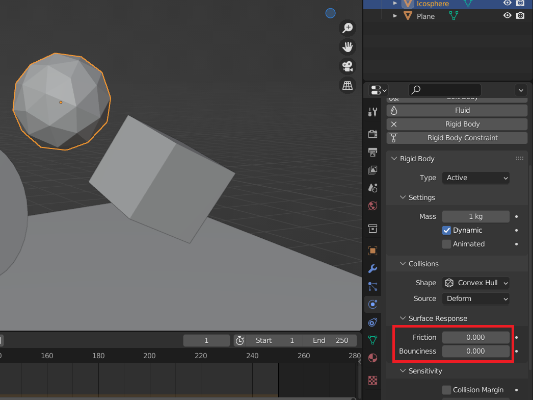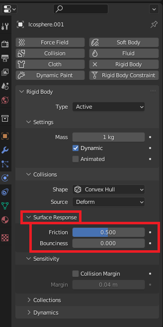 Pre nastavenie, aby sa nám objekt odrážal alebo kĺzal po povrchu slúži nastavenie Friction a Bouciness, ktoré nájdeme v menu Surface Response: