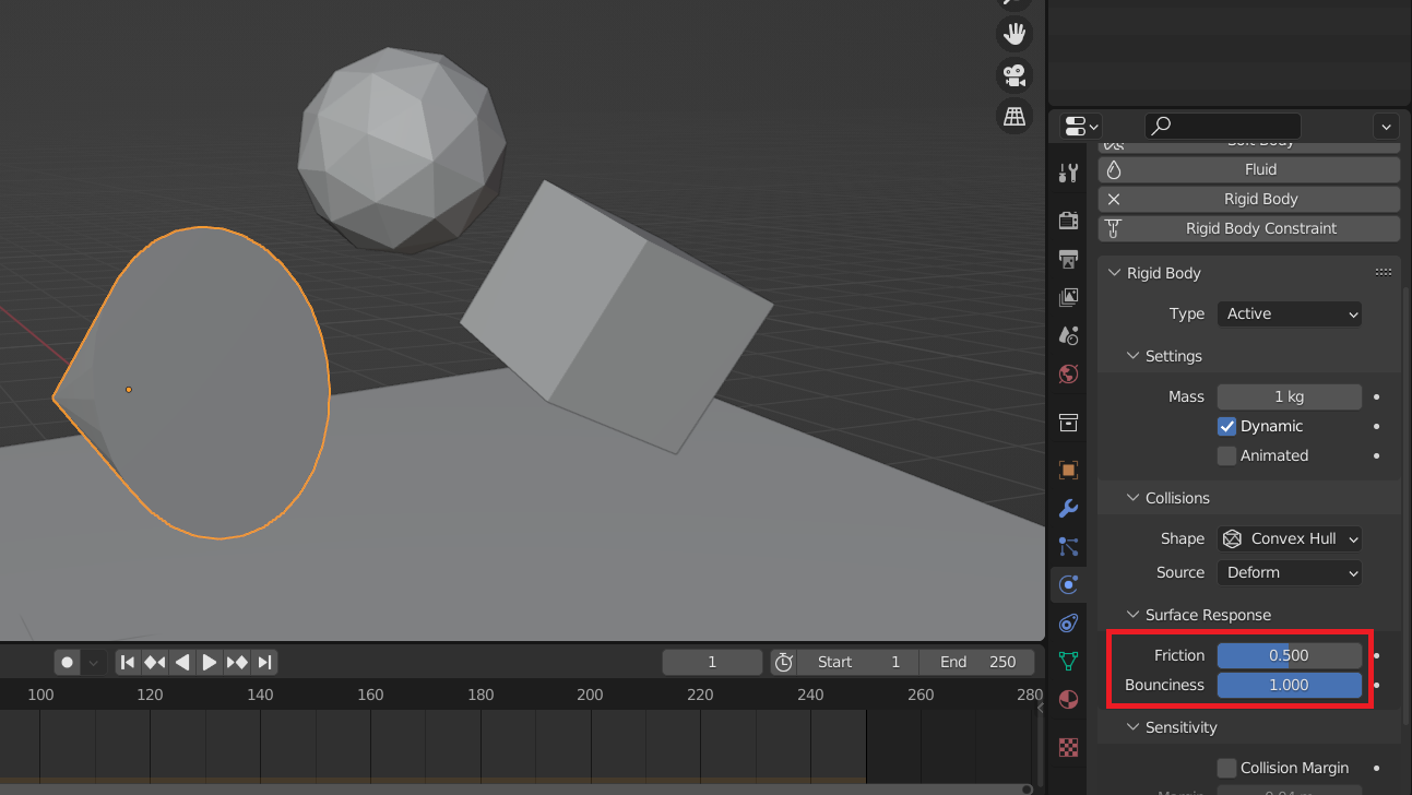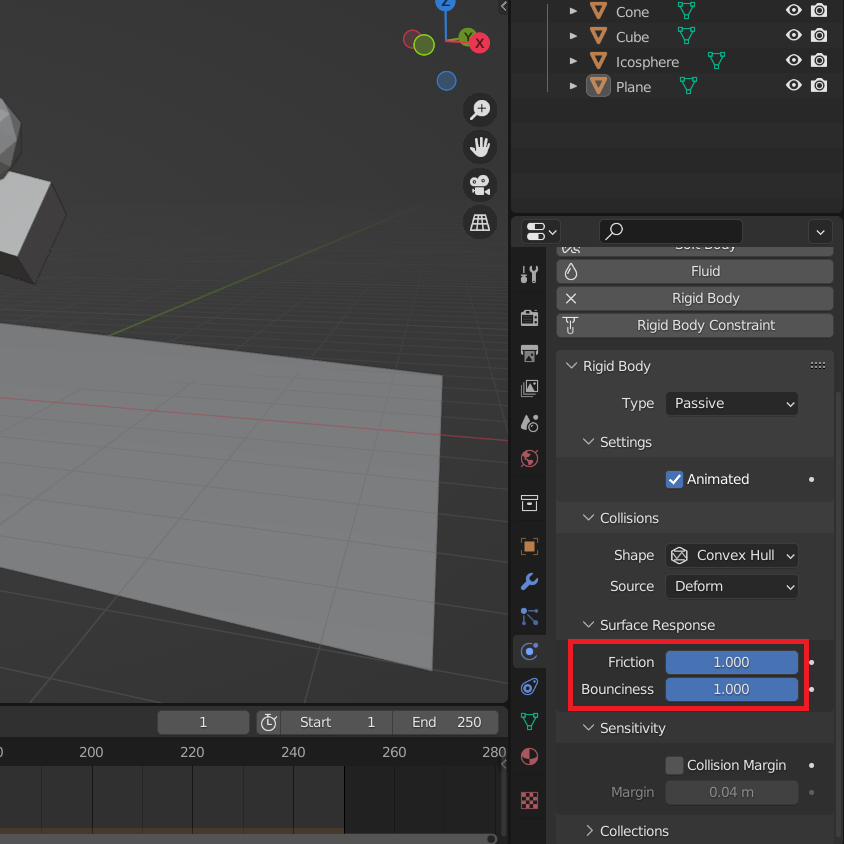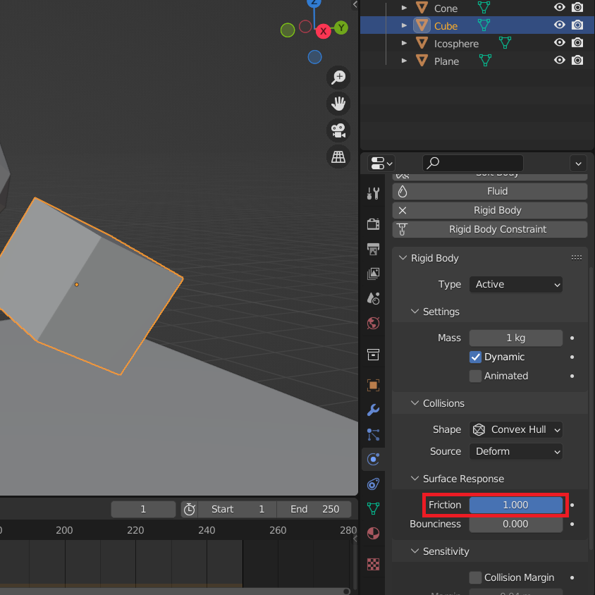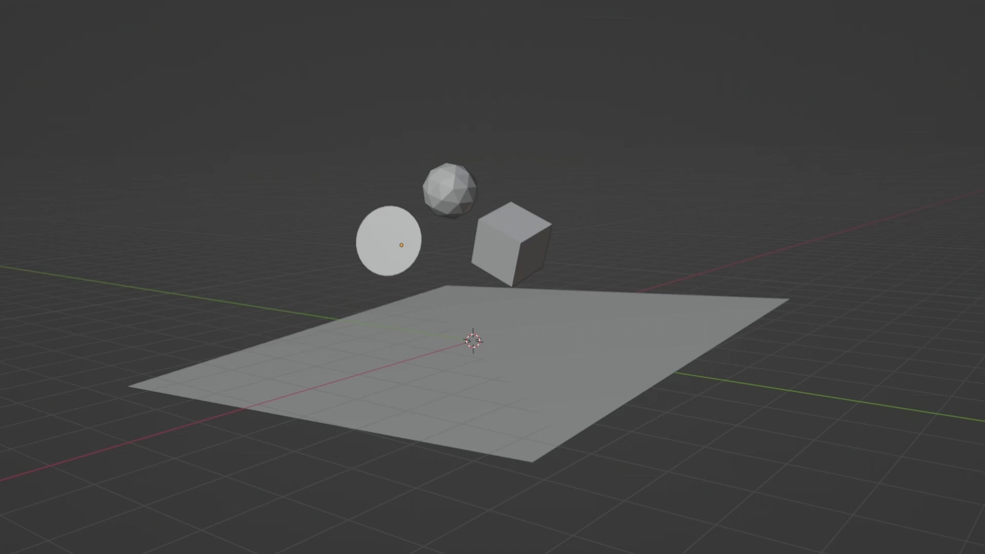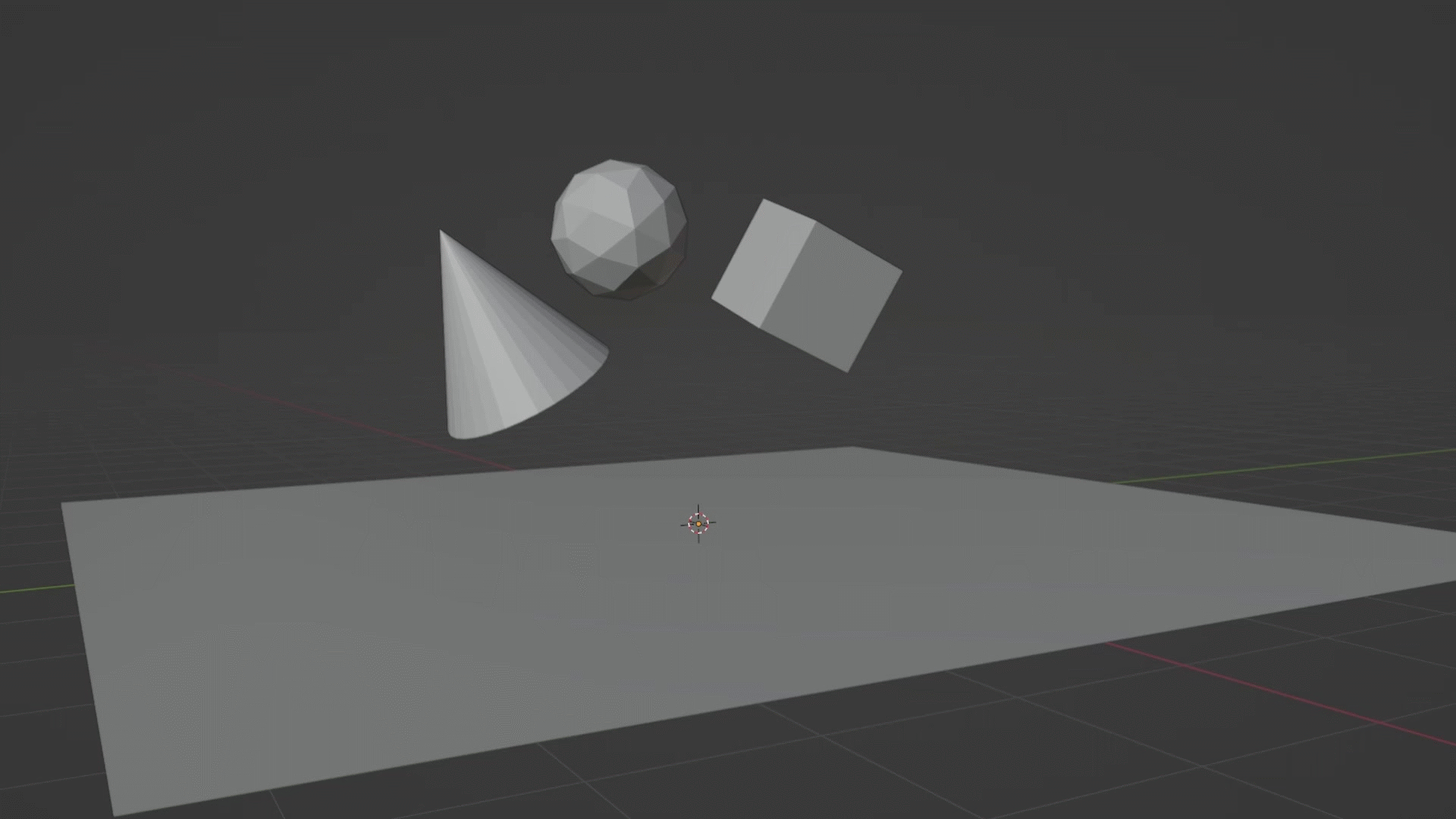 Objekty samozrejme reagujú na seba, aj keď sú rôzne natočené alebo sa od seba dokážu odrážať. Vložíme si viacero objektov, napríklad Icosphere a Cone. Objekty sa nachádzajú v menu Add a kategórii Mesh rovnako ako Plane a Cube. Objektom Icosphere a Cone nastavíme simuláciu Rigid Body a ponecháme nastavenie Active. Objekty si otočíme pomocou klávesu R. Potom stlačíme klávesy Shift + ←, tým sa nám timeline vráti na začiatok. Potom stlačíme kláves medzerník pre spustenie simulácie: