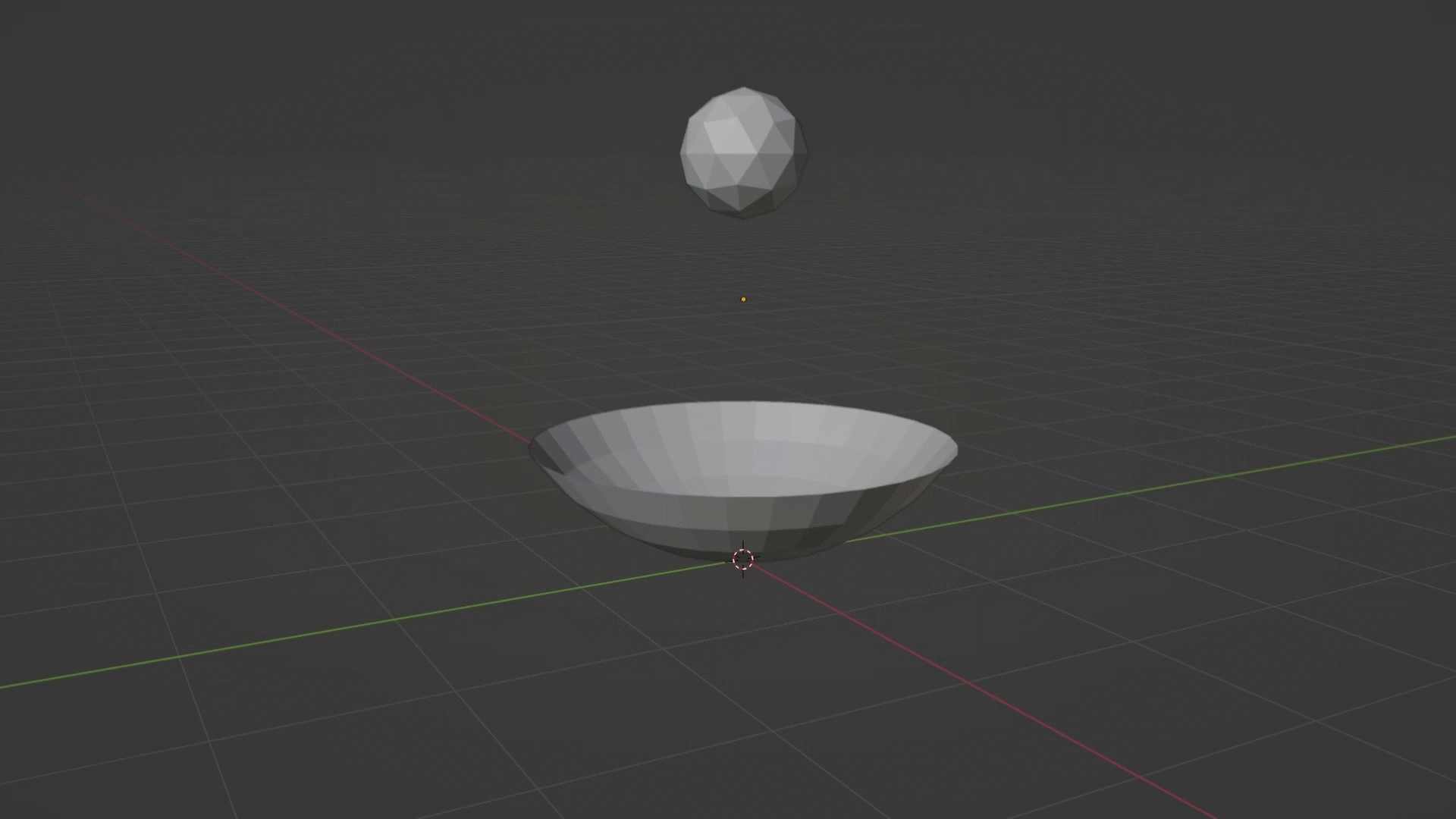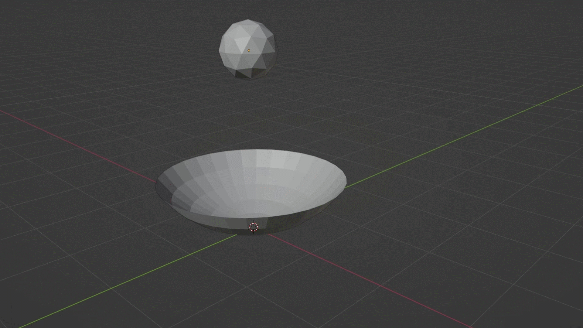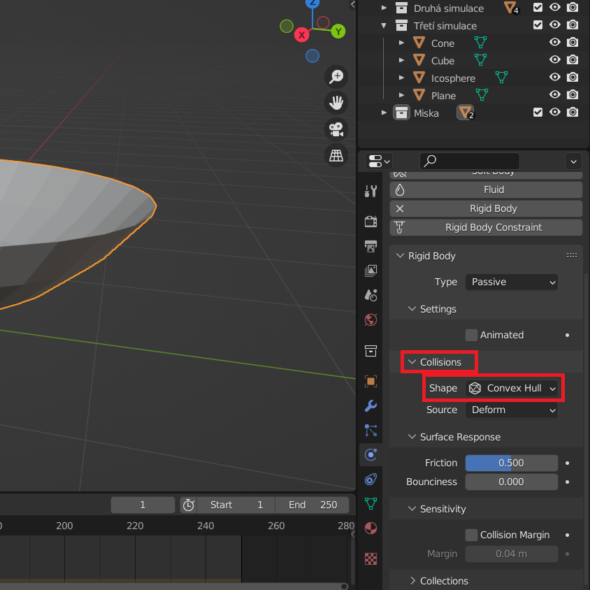 Vidíme, že objekt nespadol do misky, ale zastavil sa na neviditeľnej hranici. Je to tým, že máme nastavené v menu Collisions v nastavení Shape možnosť Convex Hull. Toto nastavenie sa snaží čo najviac zjednodušovať sieť objektu na simuláciu a tým pádom upravené objekty môžu vytvárať tento problém: