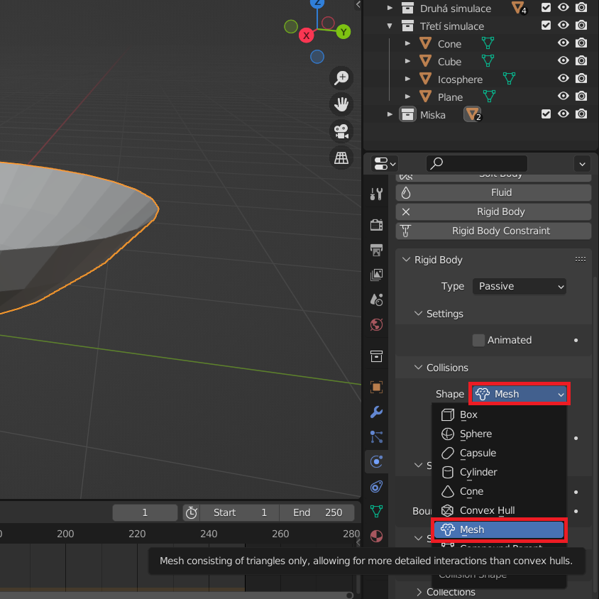 Keď si rozklikneme menu možností Shape, tak si zvolíme možnosť Mesh. Toto nastavenie počíta sieť objektu ako trojuholníky a berie ho ako celok. To umožňuje detailnejšiu simuláciu, ale pri väčších a zložitejších simuláciách môže spomaľovať výkon PC: