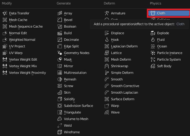 Simulácia látky je jedna z najnáročnejších simulácií grafiky. Táto simulácia je tiež modifikátor ako Soft Body. Simulácia tiež reaguje na iné objekty alebo sily ako napríklad vietor. Môžeme simuláciu použiť aj na modelovanie 3D objektov, napríklad na vankúš. Ako je spomenuté, táto simulácia je modifikátor av zozname modifikátorov sa nachádza v stĺpci Physics úplne hore: