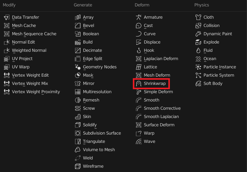 Modifikátor Shrinkwrap sa nachádza v kategórii Deform a snaží sa preniesť každý vrchol modifikovaného objektu na najbližšie vrcholy zvoleného objektu. Tento modifikátor môžeme využiť na povrchy, krivky alebo texty: