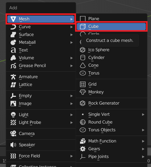 Ako prvý si ukážeme modifikátor Bevel na objekte Cube. Otvoríme si menu Add pomocou klávesovej skratky Shift + A. Rozklikneme si kategóriu Mesh a zvolíme objekt Cube: