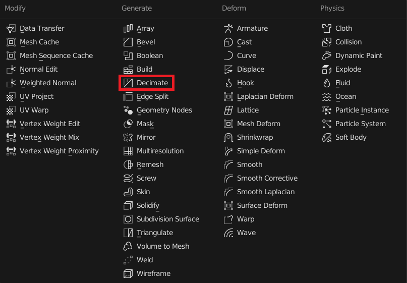 Modifikátor Decimate znižuje počet plôch na objekte s minimálnym zmenou tvaru. Vysoký počet plôch môže spôsobiť to, že sa nám Blender môže začať kosiť. Na objektoch s veľkým počtom plôch môžeme použiť tento modifikátor Decimate: