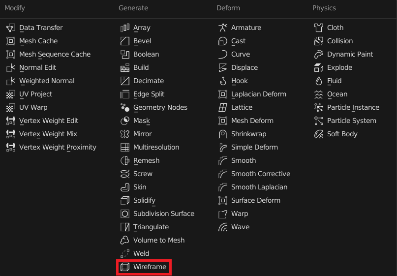 Tento modifikátor Wireframe pretvára sieť objektu na mriežku. Je dôležité, aby objekt mal plochy, inak modifikátor Wireframe nebude fungovať: