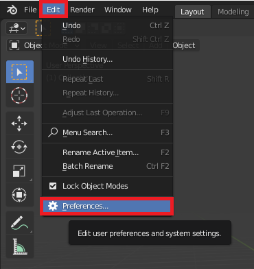 Ako si pridať nejaký plugin sme si už ukazovali, ale či niekto zabudol, tak si to pre istotu radšej zopakujeme. Pluginy nám uľahčujú prácu v Blenderu. Sú to takzvané addony, ktoré sú vytvorené užívateľovi k zľahčenie práce. Pluginy sa pridávajú v hornej lište Edit - Preferences.
