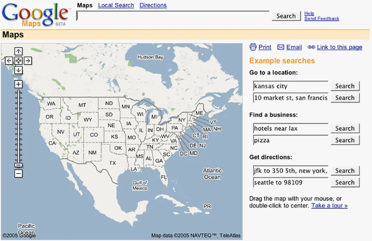 A potom prišiel deň, keď sa zrodili Mapy Google. Spočiatku to však nebola tá sofistikovaná mobilná aplikácia, ktorá dnes dokáže nájsť najlacnejšie reštaurácie v okolí alebo zobraziť časy odchodov verejnej dopravy. Prvá verzia z februára 2005 bola veľmi jednoduchá a, ako asi nikoho neprekvapí, fungovala iba na počítačoch. Podľa Googlu bolo jej hlavným cieľom pomôcť ľuďom dostať sa z bodu A do bodu B. Okrem trás mohli používatelia tiež vyhľadávať významné budovy, napríklad nemocnice alebo supermarkety.