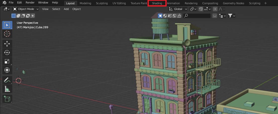 Než začneme vytvářet textury, přepneme se do pracovního prostoru Shading, který nalezneme v horní liště. Tento prostor je určený pro vytváření textur: