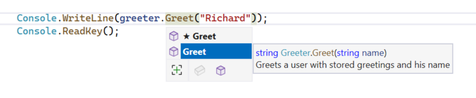 Pri metóde Greet() nám prostredie IDE vygenerovalo komentár s