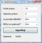 Program Slúžte na uľahčenie výpočtu kombinácií podľa kritérií, ktore si zvolí užívateľ. Jeho ovládanie je jednoduché a myslím, že k jeho ovládaním netreba dlhšej popis. Výpočtom kombinácií sa zaoberá trieda VýpočetKombinácií, ktora obsahuje 5 funkcií. Funkciám na výpočet faktoriálu a 4 Funkcie pre konkretne typy variáciám, alebo permutácií. Program je napisane v jazyku C# .NET.