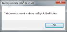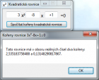 Aplikácia slúži na výpočet reálnych koreňov kvadratickej rovnice. Počíta s rôznymi variantmi (dva korene, jeden dvojnásobný, žiadny koreň, prípadne, že sa nejedná o kvadratickú rovnicu. Je to má prvý okenné aplikácie v C# a vyskúšal som si na nej: prácu s prvkami formulára, zamedzenie zmeny veľkosti okna, dialógové okno , podmienky atď.