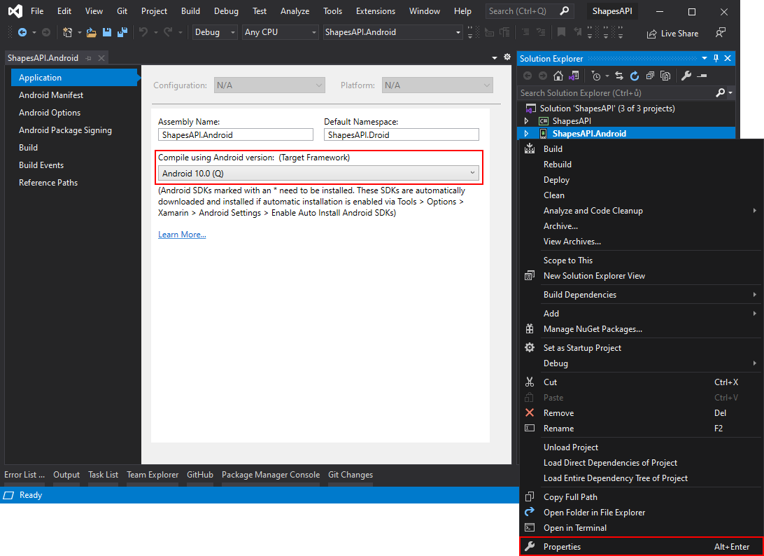 Plná verzia Shapes API je v Xamarin.Forms prítomná až od verzie 5.0, preto si udržujte svoje projekty vždy aktualizované. Od tejto verzie používa Xamarin.Forms na Androide iba nové knižnice AndroidX. Po aktualizácii je teda nutné v Properties prepnúť cielenú verziu Android projektu na Android 10 alebo novší: