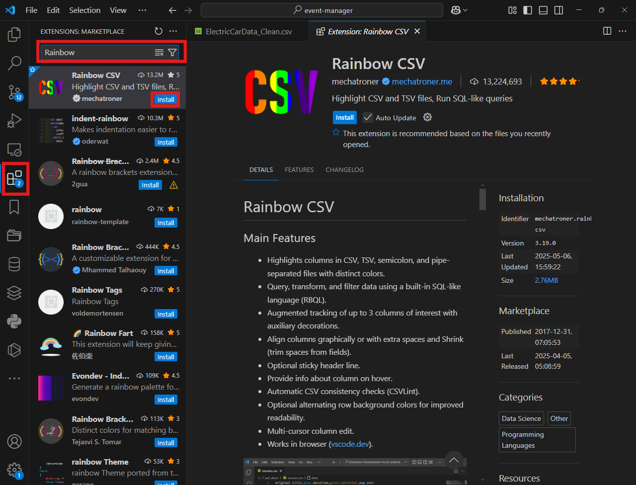 Ak sa tak nestane, sami si ho môžeme pridať kliknutím na ikonu Extensions, kde vyhľadáme rozšírenie Rainbow CSV a pridáme si ho kliknutím na Install: