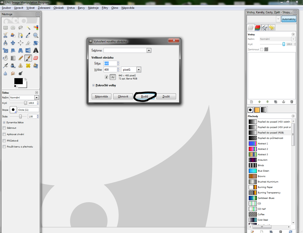 - Vytvorte si nový súbor (Súbor> Nový) a zvoľte si ľubovoľné rozmery (zapamätajte sa ich) a kliknite na tlačidlo "Buď"