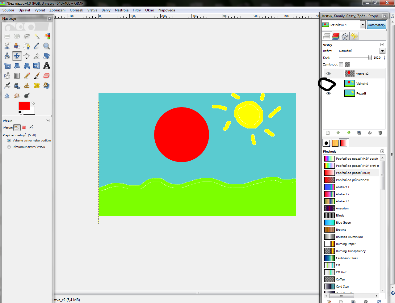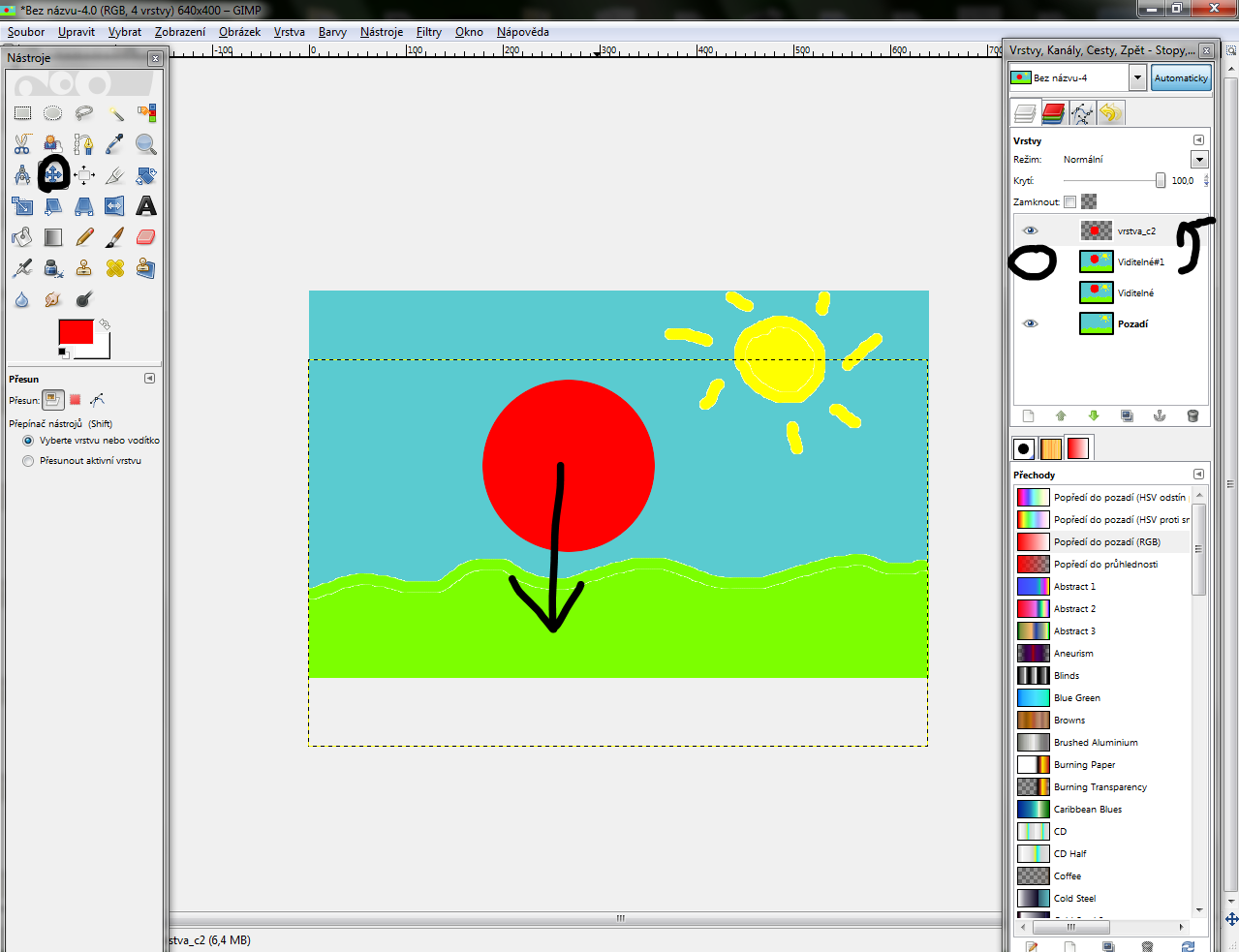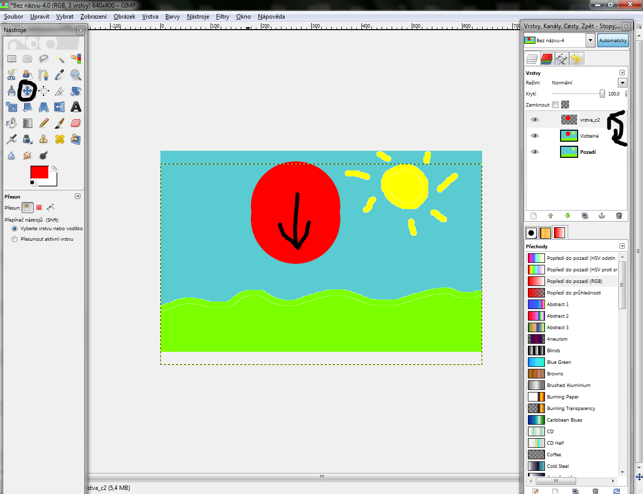 vrstva čo sme robili) posunieme úplne hore a vyberieme si nástroj "Posunúť"