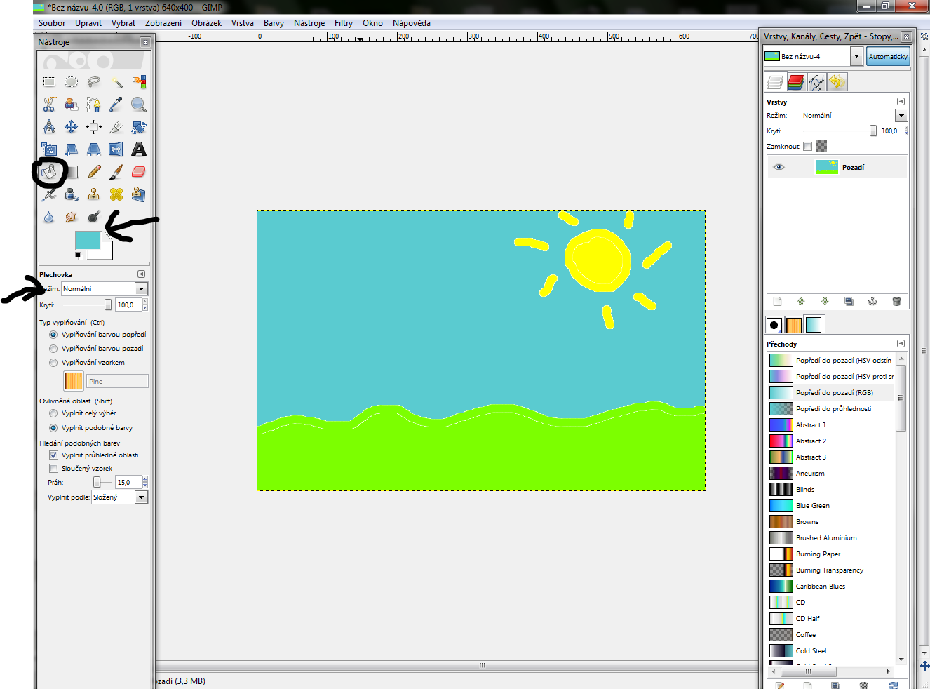 - Gimp nám automaticky vykreslil 1 vrstvu "Pozadie" (v slovenskej verzii) -