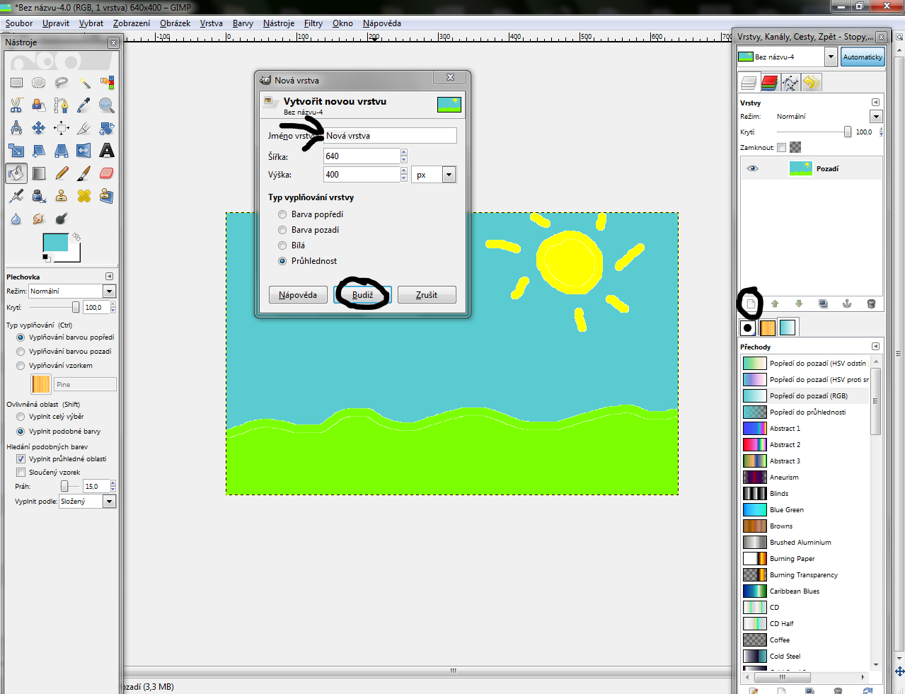 - Vytvorte si novú vrstvu s rovnakými rozmermi (Jeslti je vám tam GIMP nedal sám, trénujte pamatováka)
