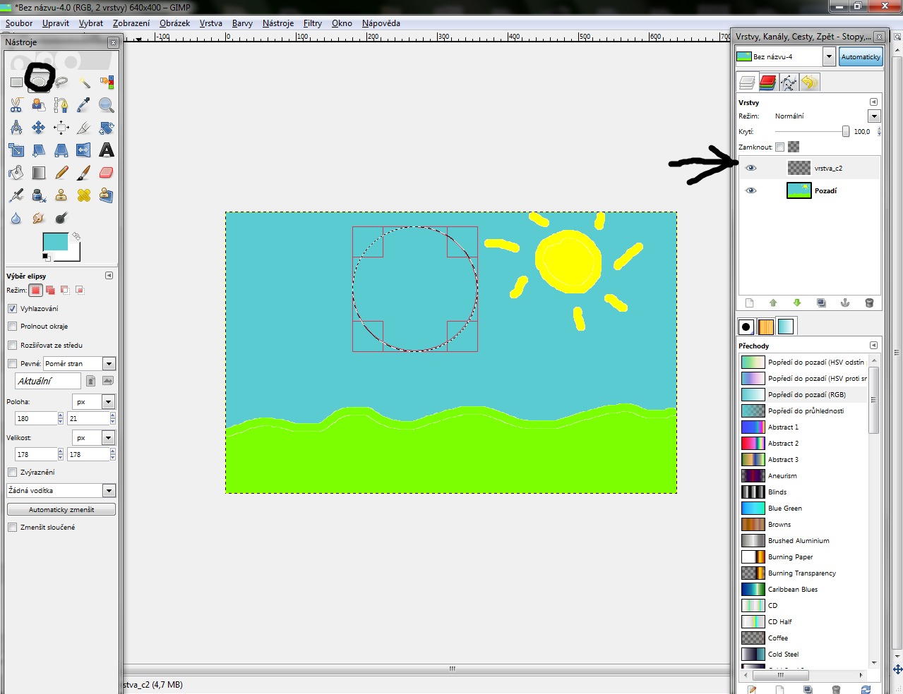 Ak to máte, môžeme začať. Zvoľte si položku "Výber eliptických oblastí" a niekam dajte kruh (aby bol presný, pridržte kláves Shift).