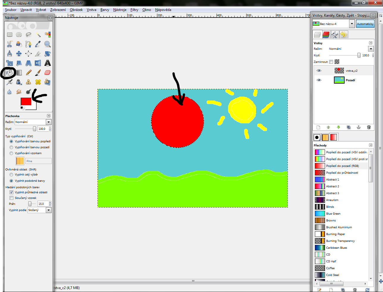 4.) Zoberte si plechovku s ikonou plechovky a chrcněte do toho .. vlastne zatiaľ je to kružnica .. ... farbu!