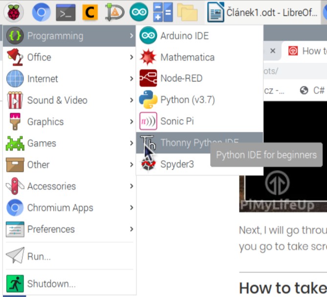 Na Raspberry máme pre programovanie v Pythone predinštalovaných niekoľko možností, ja som si vybral Thonny Python IDE, ale možnosťou je viac. Stačí po prvom úspešnom spustení kliknúť vľavo hore na ikonku Raspberry, alebo stlačiť kláves Win a vysunie sa nám základná ponuka. V tej prejdeme na položku "Programming" a tam si môžete vyskúšať, čo sa vám najviac páči. Ak by sa vám nepáčilo ani jedno IDE, môžete si ako ja doinštalovať program Spyder3. Stačí kliknúť na otvoriť "Terminal" (také to čierne okienko, v predvolenom nastavení je na hornej lište) a zadať príkaz: