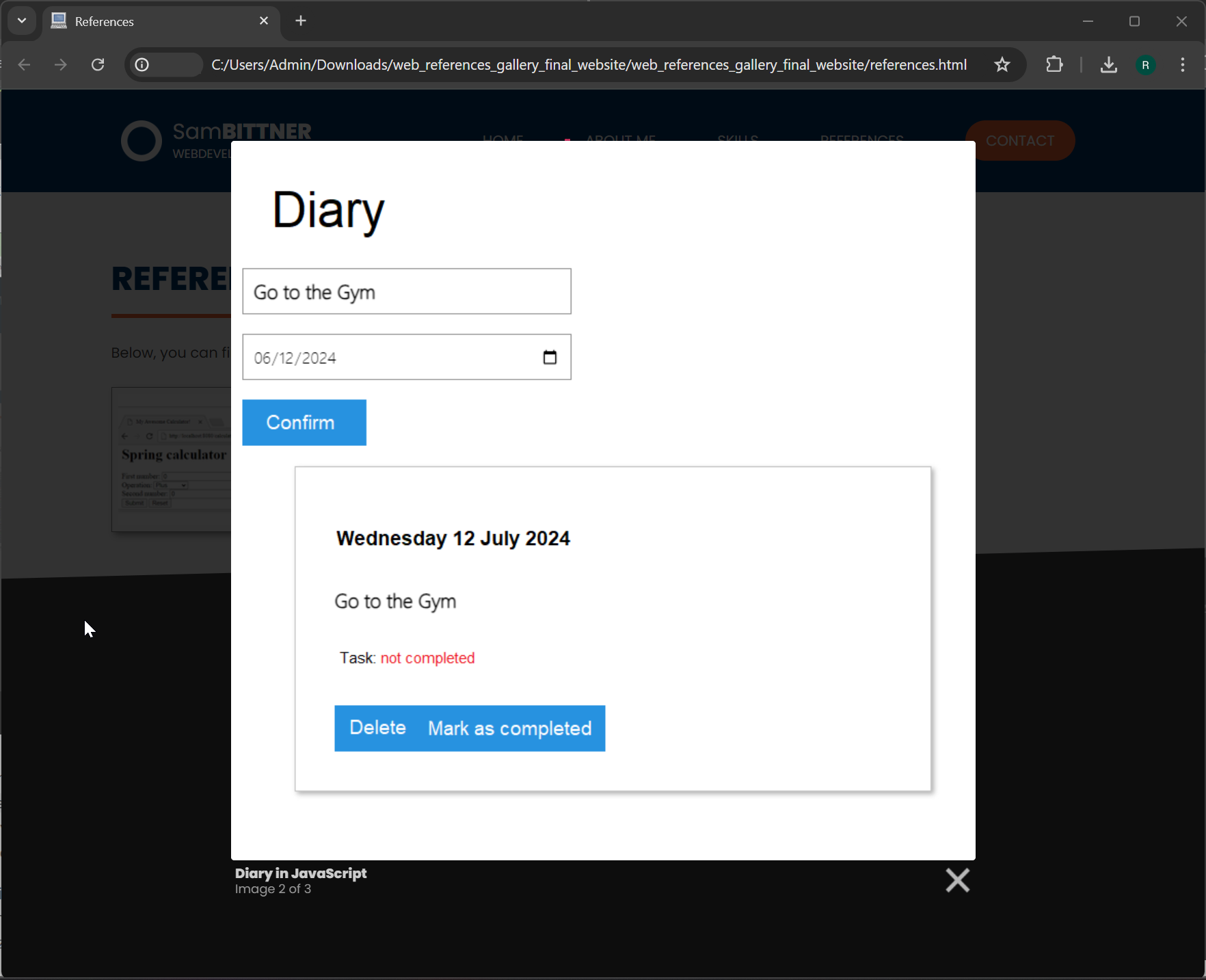 <article> <header> <h1>References</h1> </header> <section> <p>Below, you can find samples of my work up to now. I can offer you the opportunity to develop similar custom software.</p> <div id="references"> <a href="images/spring_calc.png" title="Calculator in Java Spring Boot"> <img src="images/spring_calc_preview.png" alt="Calculator in Java Spring Boot" /> </a> <a href="images/diary_js.png" title="Diary in JavaScript"> <img src="images/diary_js_preview.png" alt="Diary in JavaScript" /> </a> <a href="images/sabi_website.png" title="Web in HTML and CSS"> <img src="images/sabi_website_preview.png" alt="Web in HTML and CSS" /> </a> </div> </section> </article>