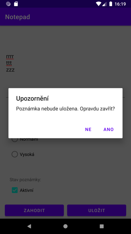 Z obrázku je zrejmé, že sa toto dialógové okno, od dialógového okna s detailom uloženej poznámky, líši tlačidlami. Dialóg s detailom poznámky mal iba jedno tlačidlo ZAHODIŤ na jeho zatvorenie. Tento dialóg má tlačidlá dve.