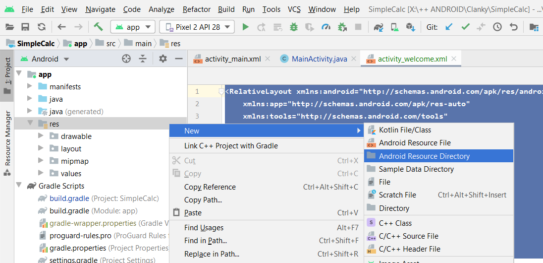 Pravým tlačidlom myši klikneme na priečinok res/ v štruktúre