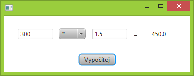 @FXML private void handleVypocitejButtonAction(ActionEvent event) { double cislo1 = Double.parseDouble(cislo1TextField.getText()); double cislo2 = Double.parseDouble(cislo2TextField.getText()); String operace = (String)operaceComboBox.getSelectionModel().getSelectedItem(); double vysledek = 0; switch (operace) { case "+": vysledek = cislo1 + cislo2; break; case "-": vysledek = cislo1 - cislo2; break; case "*": vysledek = cislo1 * cislo2; break; case "/": if (cislo2 != 0) vysledek = cislo1 / cislo2; break; } vysledekLabel.setText(String.valueOf(vysledek)); }
