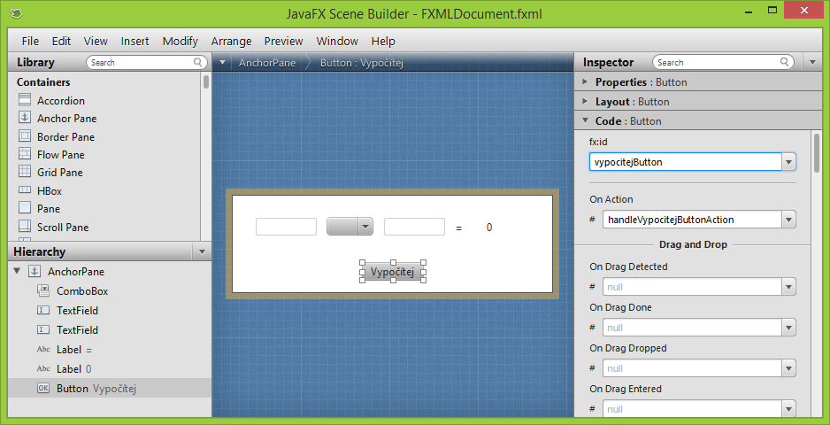 public class FXMLDocumentController implements Initializable { @FXML private TextField cislo1TextField; @FXML private TextField cislo2TextField; @FXML private ComboBox operaceComboBox; @FXML private Button vypocitejButton; @FXML private Label vysledekLabel; @FXML private void handleVypocitejButtonAction(ActionEvent event) { } @Override public void initialize(URL url, ResourceBundle rb) { } }