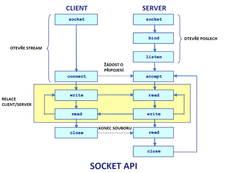 Vieme, že komunikácia klienta a servera bude prebiehať prostredníctvom socketov s pomocou protokolu TCP. Klientsky program vytvorí socket na svojom konci komunikácie a pokúsi sa ho pripojiť k serveru. Po vytvorení spojenia server vytvorí objekt socketu na svojom konci komunikácie. Klient a server teraz môžu komunikovať zápisom a čítaním zo socketu: