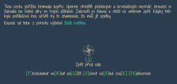 - 28.8.2018 - Dnes 9 hodinové kódění s Jindrom Maco. Demo, ktoré vzniklo, úplne predčilo všetky moje očakávania. Rukou písaný font, podpora farebných schém, zvýrazňovanie objektov, funkčných klávesov a priamej reči v texte. Zvuk krokov s osamotenú ozvenou pri čítaní o preskúmavaní tajomných lokácií rozhodne tiež robí svoje. A meniace sa farba podľa povahy lokácie. Skrátka to funguje. Dobre. Kód je kryštalicky objektový, s Jindrom sa dokonale zhodneme na návrhu a niekoho z nás vždy napadne ako to ešte celé zlepšiť. Všetky lokácie sú v zdrojovom JSON s hrou (áno, nerobíme hru, ale univerzálne engine). Nabudúce nás čaká skriptovanie, ktoré má už položený veľmi silný základ. Ak niekto chcete hejtovat, máme to tu na gitLABU (zdravím Microsoft) - https://gitlab.com/...-cz/the-game (ale Jindra to ešte necommitnul ku dňu čo toto píšem)