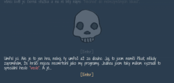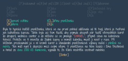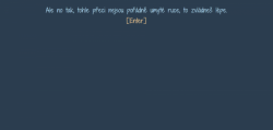 - 11.9.2018 - Jindra je chorý, takže dnes kodi sám. Začal som úpravou vzhľadu, ktorá skončila (ako všetko) nadávaním na CSS a potom veľmi slastným pocitom z animácie a desaturácia textu, ktorá je kompromisom medzi očakávaním a množstvom času, ktoré som ochotný u CSS prepáliť. Zistil som, že font, čo sme vybrali a kontrolovali u neho špeciálne češtinu, nevie "ď" (erhmm .. fucking, ermmm .. Europe ...). Triedy reprezentujúci jednotlivé akcie dostupné v skriptoch som rozčlenil do priečinkov a pridal mnoho ďalších. Sprevádzkoval som cyklení medzi schémami konzoly a spúšťanie príkazov mimo miestnosti, priamo na PLAYER. Práve som asi 20x zkouknul intro miestnosť, interpretující kód priamo z JSON, ktorý zobrazuje rôzne naformátovaný text, animuje, čaká na intervaly (či žijú premiešajú v JS), čaká na klávesy, prehráva zvuky pre živšie predstavy deje. Ak sú v tomto texte chyby mi je jedno, idem spať. Ak to niekto číta, tak pin k mojej kreditke je 1234.