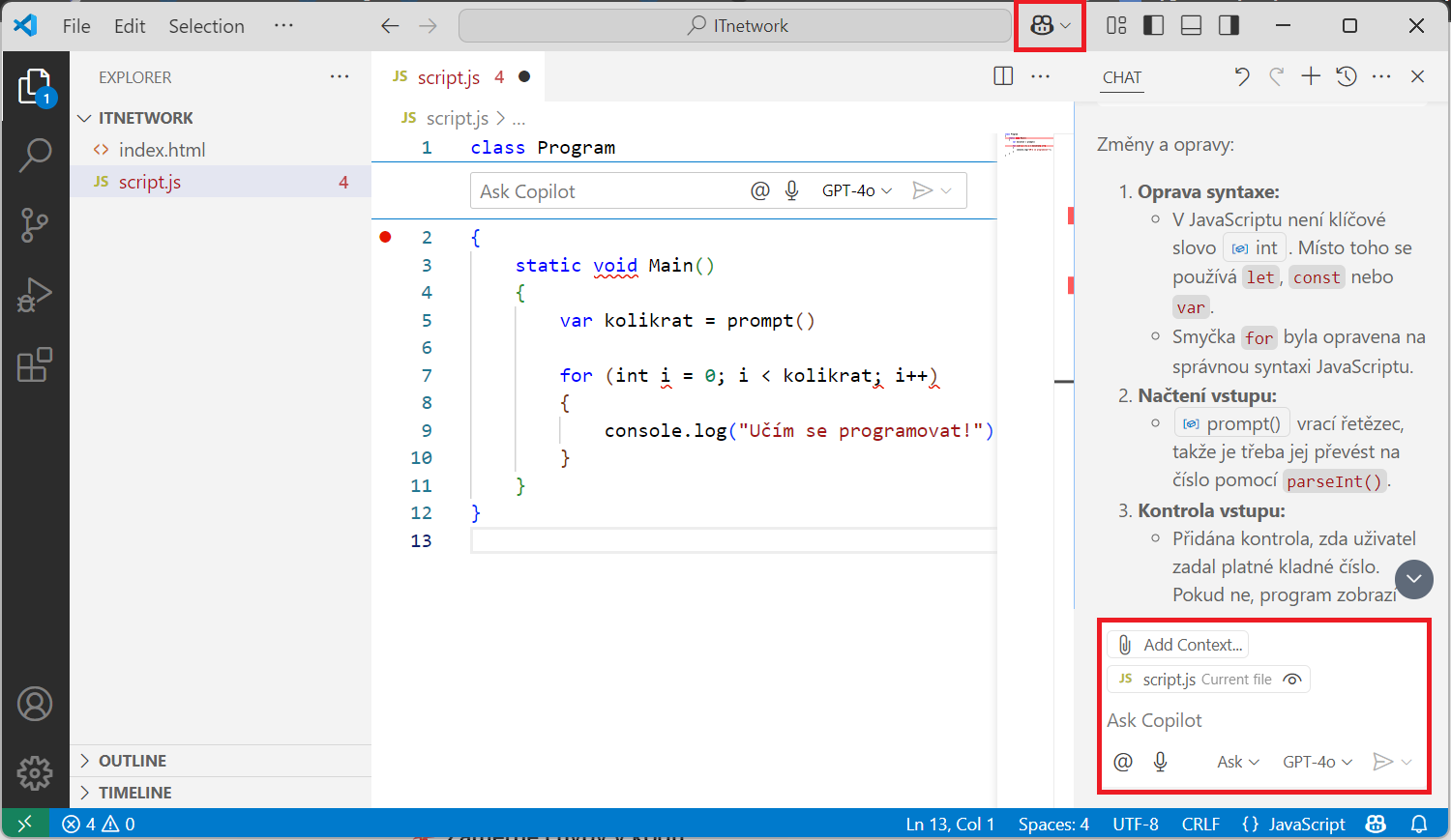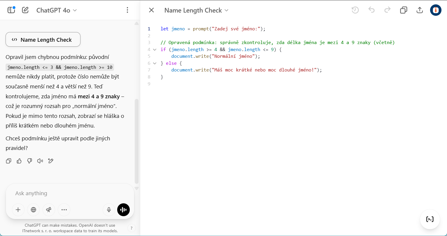 Pozor: AI je dobrý pomocník, ale zlý pán! Táto lekcia ti ukáže, ako ti AI nájde chybu v tvojom kóde alebo jednoduché úlohy vyrieši úplne za teba. Najprv však musíš nad úlohou premýšľať a skúšať ju sám, než požiadaš o pomoc AI. Inak nebudeš schopný v zamestnaní riešiť komplexnejšie úlohy, s ktorými ti AI nepomôže, pretože jej nemôžeš poslať celý firemný projekt. Vo vlastnom záujme používaj AI len ako pomocníka, keď nevieš, ako ďalej, a už si vyčerpal všetky možnosti.