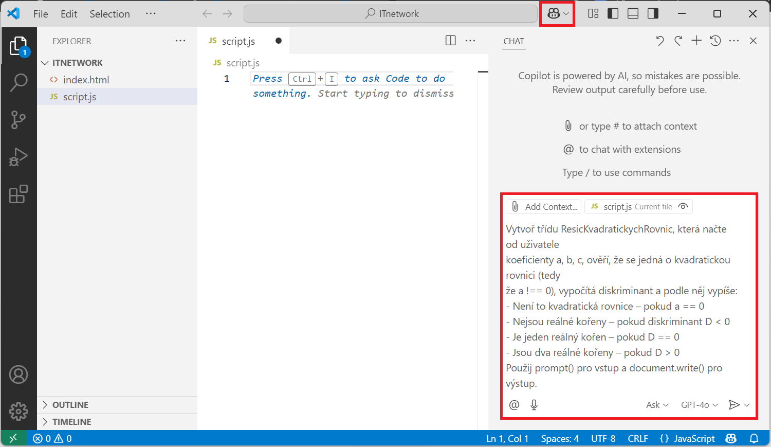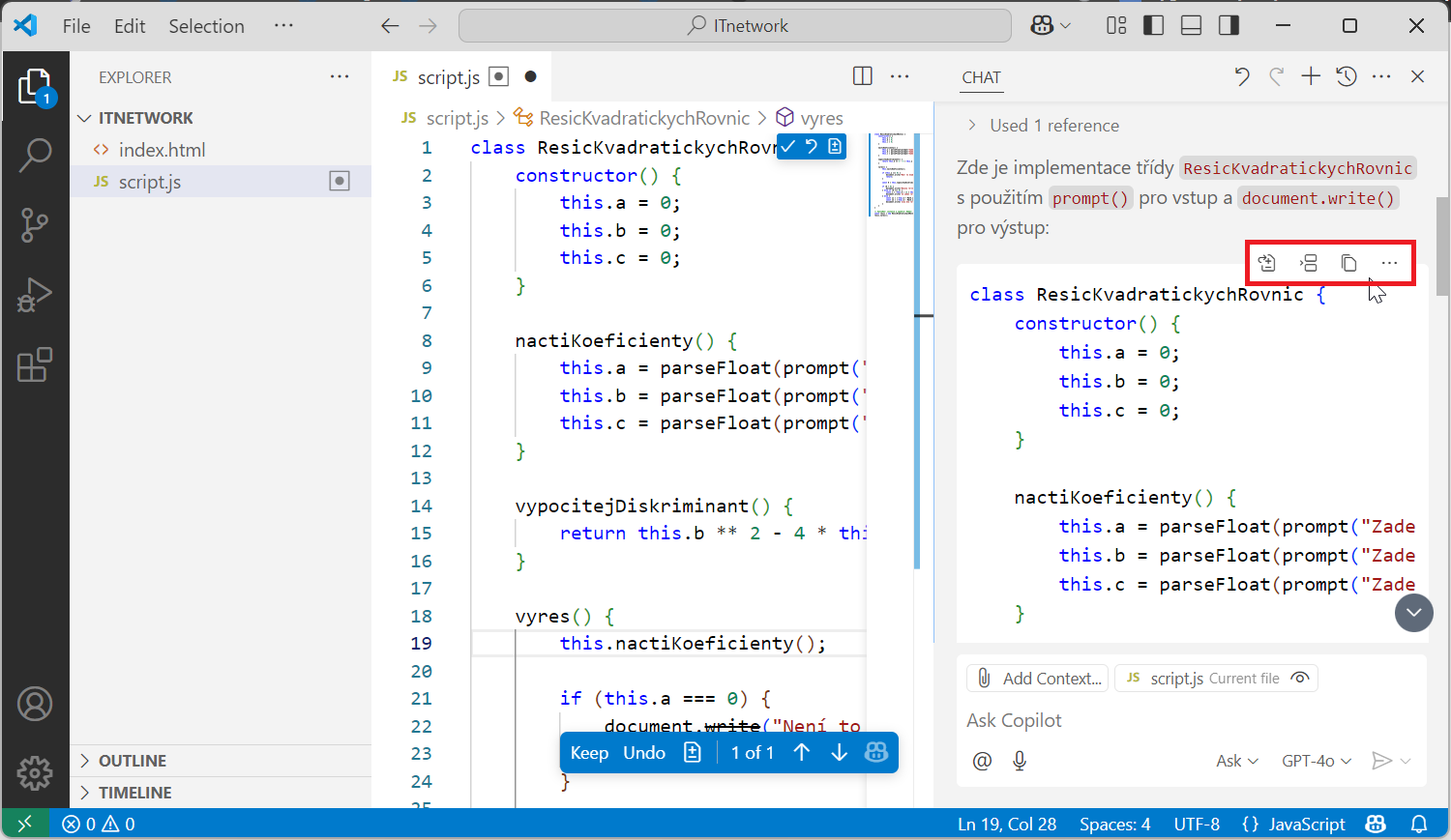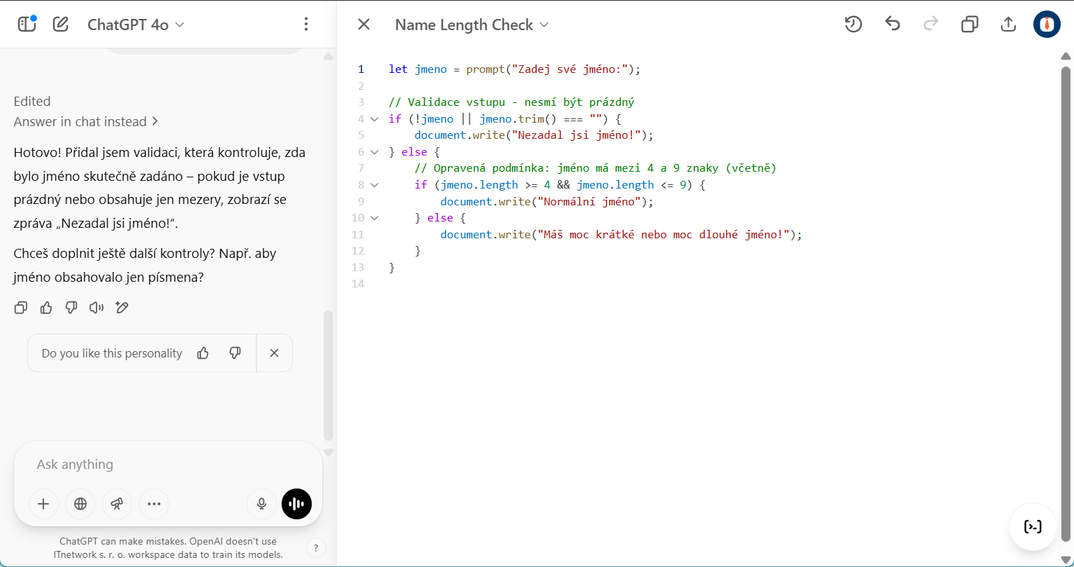 Pri správne zadanom prompte môžeme v našom kóde jednoducho doplniť chýbajúcu funkcionalitu: