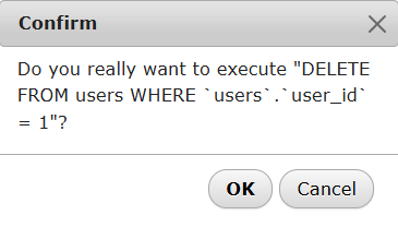 Skúsme si aj niekoho vymazať. V phpMyAdmin jednoducho klikneme na červené tlačidlo Delete. Otvorí sa nám dialógové okno, v ktorom máme potvrdiť zmazanie záznamu. V ňom je tiež uvedený zodpovedajúci SQL dotaz: