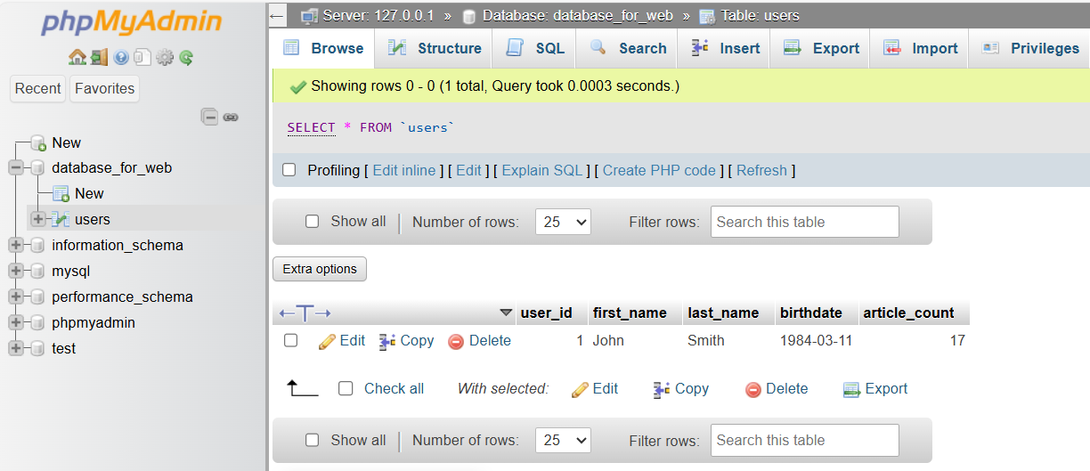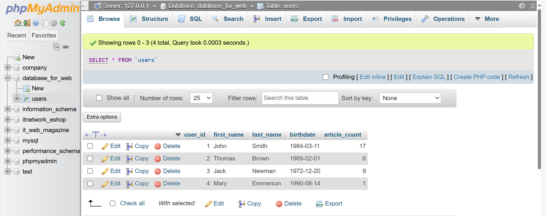 Tabuľka s novo pridanými používateľmi bude v phpMyAdmin vyzerať takto: