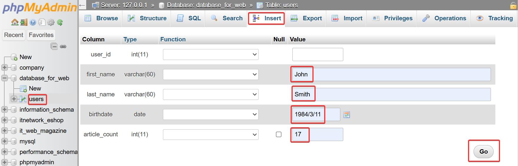Vloženie nového používateľa si ukážeme opäť najskôr cez phpMyAdmin.