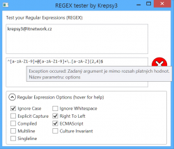 Jednoduchá utilita na testovanie a hranie sa s regulárnymi výrazmi. Aplikácia obsahuje dve textové polia, jedno pre testovaný string a druhé pre samotný výraz, ktorým sa testuje. Ďalej umožňuje zapnúť a vypnúť Regex OPTIONS a máte tak možnosť otestovať regulárny výraz pre rôzne spôsoby použitia.
