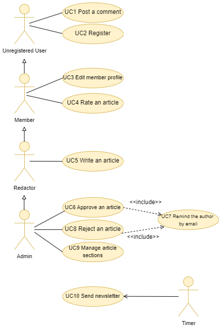 <<include>>. Tá sa používa v prípade, že je nejaká funkcionalita dôležitá natoľko, že ju chceme mať v diagrame namiesto toho, aby sme ju len vyhlásili súčasťou nejakého use case. Prípad použitia napojený pomocou väzby<<include>>sa spustí vždy, keď je spustený prípad, na ktorý je napojený. Tu je autor článku dostane upomienku pri schválení a zamietnutí článku. Samotné upomenutie v sebe bude mať ďalšiu logiku, napr emailom, SMS a pod. My ho máme zabalený v jednom prípade použitia. Okrem<<include>>existuje ešte väzba<<extend>>, ale tá je veľmi zavádzajúca a príliš sa nepoužíva, takže sa ňou nebudeme zaoberať. - Posledným aktérom je Timer (čas), ten sa v určitú dobu spustí a vykoná odoslanie aktualizácií emailom. Aktéra čas zakresľujeme na pravú stranu, hoci je v podstate aktívny.