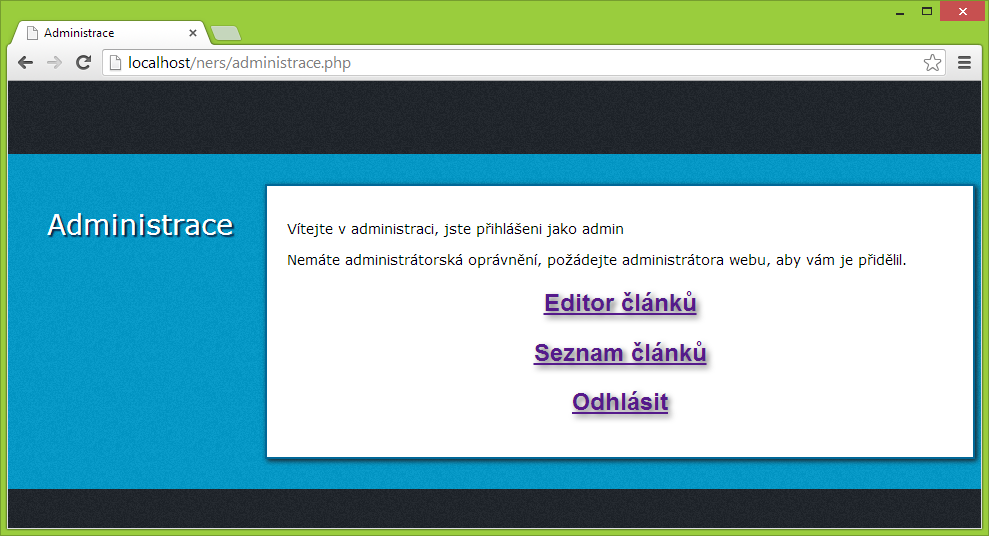 Vytvorme si teraz skript administrace.php. Bude to taký rozcestník, na ktorý aplikácie užívateľa prenesie po zaregistrovaní alebo po prihlásení. Jeho HMTL časť bude nasledujúce: