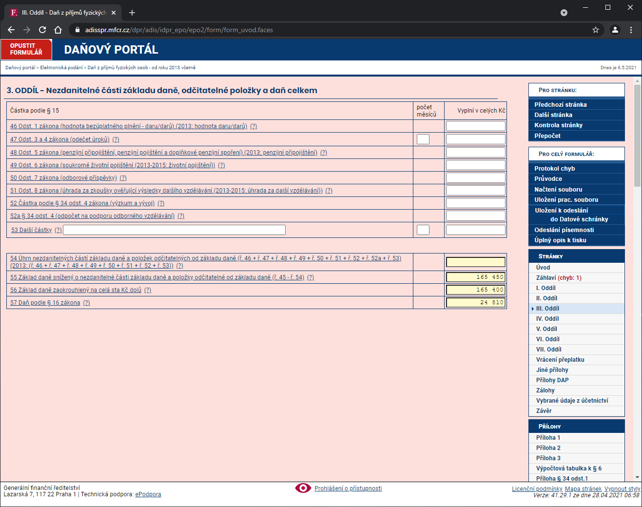 V tomto oddiele zadávate nezdaniteľnej časti základu dane. Vďaka tomu, že si napríklad platíte dôchodkové poistenie, môžete mať nižšie dane. Ja nič také nemám, tak nebudem nič vyplňovať. Nechám však vyplnené riadky 55., 56. a 57., ktoré sa automaticky vyplnili: