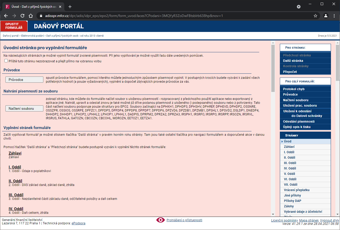 Aby som to predstavil, napravo máme navigáciu Stránky, kde môžeme preklikávať formulár a navigovať tak na ďalšie stránky či sa vracať. Tu je tiež dostupná kontrola formulára. My začneme záhlavím, klikneme teda na stránku Hlavička dole v menu.