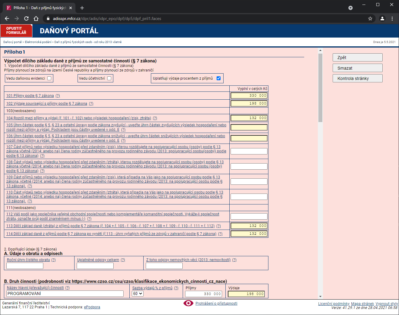 Pohnite dole do sekcie B - druh činnosti. Tu vyberieme z našeptávača názov hlavnej činnosti, u mňa to bude PROGRAMOVANIE. Ďalšia stĺpec je Sadzba výdavkov% z príjmov, tu vyberieme 60%, na to sa sťahujú tieto IT práce. Napr. poľnohospodár môže mať výdavkový paušál 80% z príjmov.