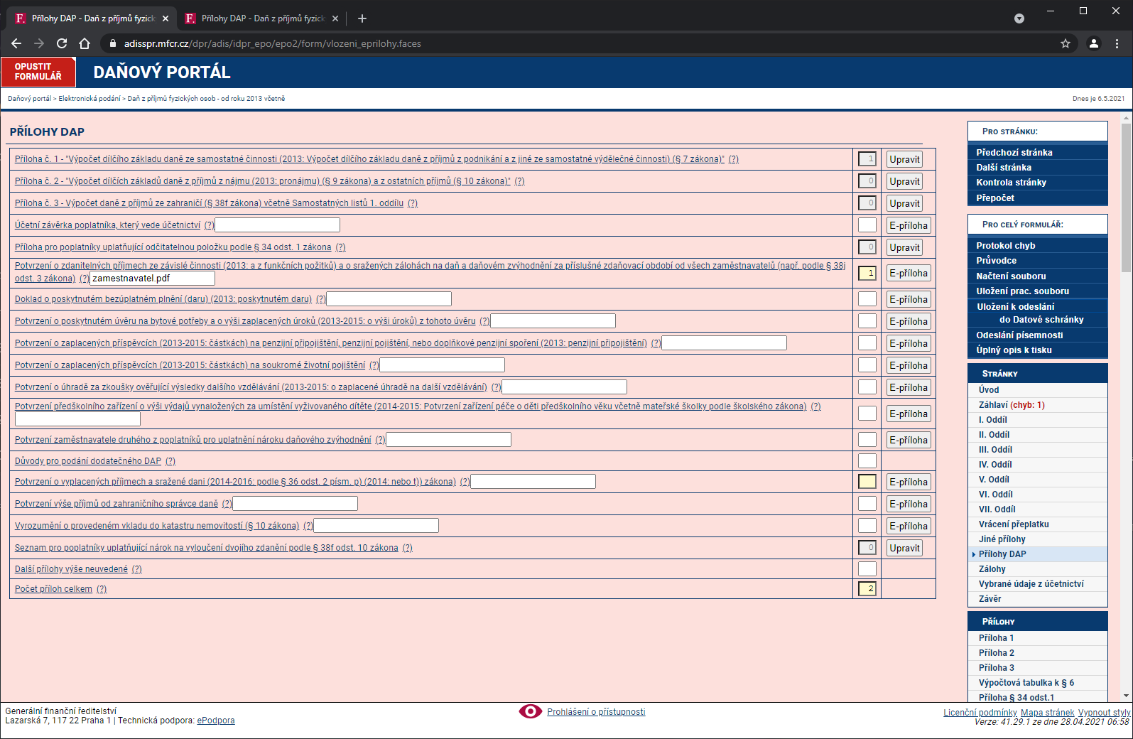 Dostávame sa k samotnému záveru, v mojom prípade stačí už len pripojiť k dokumentu prílohu Potvrdenie o zdaniteľných príjmoch zo závislej činnosti (to je dokument od zamestnávateľa, z ktorého sme vychádzali), inak máte hotovo, ak žiadne ďalšie prílohy pripájať nemusíte. Pomocou tlačidla E-príloha súbory nahráme. Vedľa prílohy máme aj polia, kde vložíme číslo 1 (ak sa tam nepridalo automaticky). Počet celkových príloh by mal byť u mňa 2: