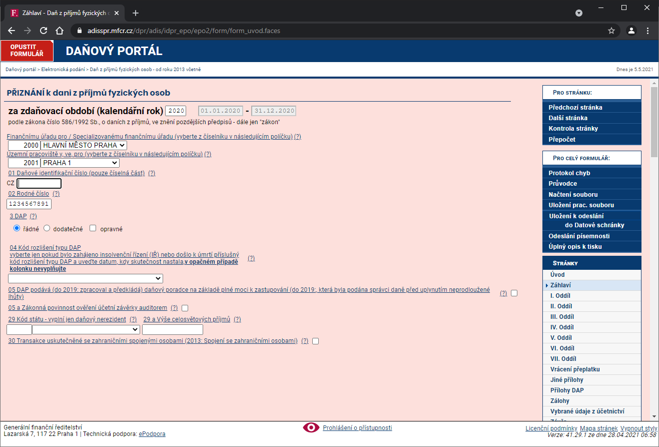 Tu vyplníme kalendárny rok (väčšinou je predvyplnené). Priznanie posielame v mieste nášho pobytu, otvoríme rozbaľovacie menu a vyplníme príslušný kraj a potom aj územný pracovisko. Vyplníme naše rodné číslo a ponecháme kolónku DAP na riadnej (posielame daňové priznanie prvýkrát za toto zdaňovacie obdobie). Pokiaľ ho opravujeme alebo posielame dodatočné, vyberieme príslušné pole. Pre mňa teda hotovo. Máme teda hlavičky vyplnené: